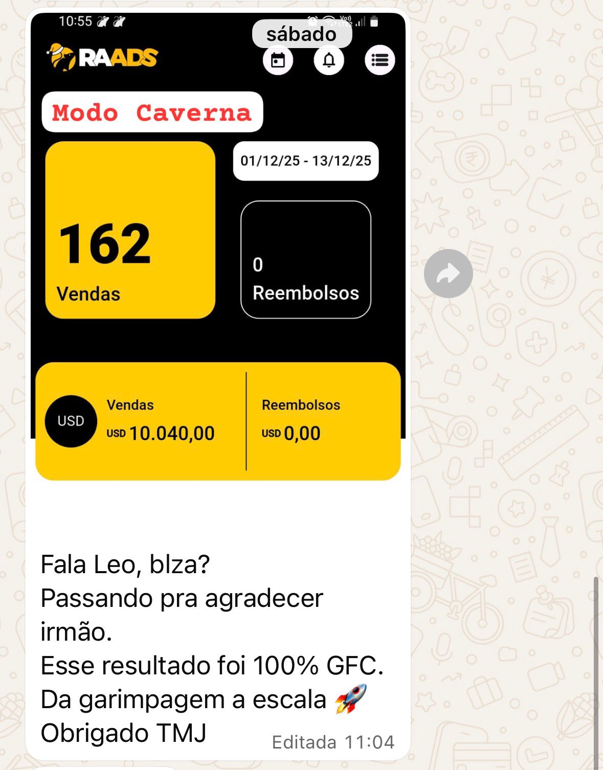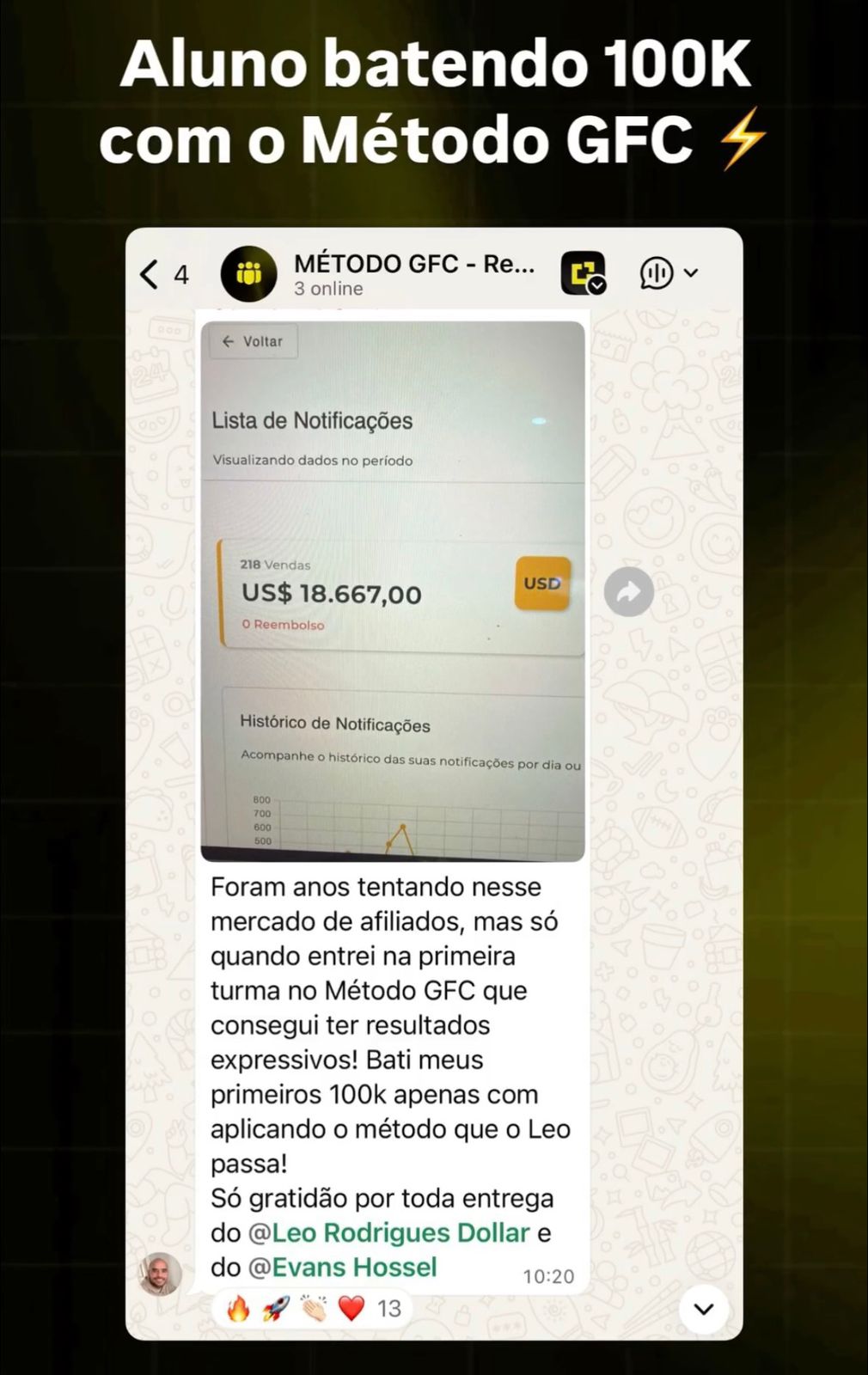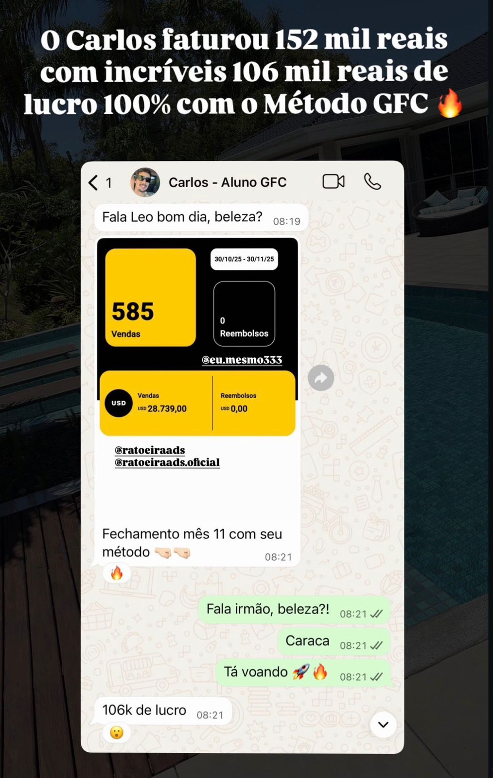 Ele é criador do Método GFC, treinamento responsável por formar afiliados que hoje vendem diariamente em países onde o CPC é mais barato e a concorrência quase não existe. Com mais de 2 milhões de reais em resultados, Leo ensina o que realmente faz no campo de batalha: estratégia limpa, análise de métricas, escala sustentável e visão de negócio para viver em dólar com previsibilidade. No GFC, você não aprende “teoria”, mas sim o caminho exato que ele trilhou para dominar a Europa como afiliado.